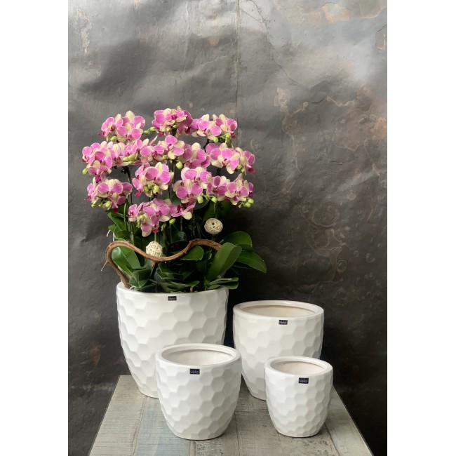 Dáng chậu cao, bề mặt dập vân nổi hình lục giác màu trắng sáng bóng nhẹ nhàng, đa dạng kích cỡ, nhỏ gọn dễ thương, rất thích hợp để trồng hoa lan tươi, cây cảnh văn phòng, cây để bàn, cắm hoa giả, hoa trang trí...