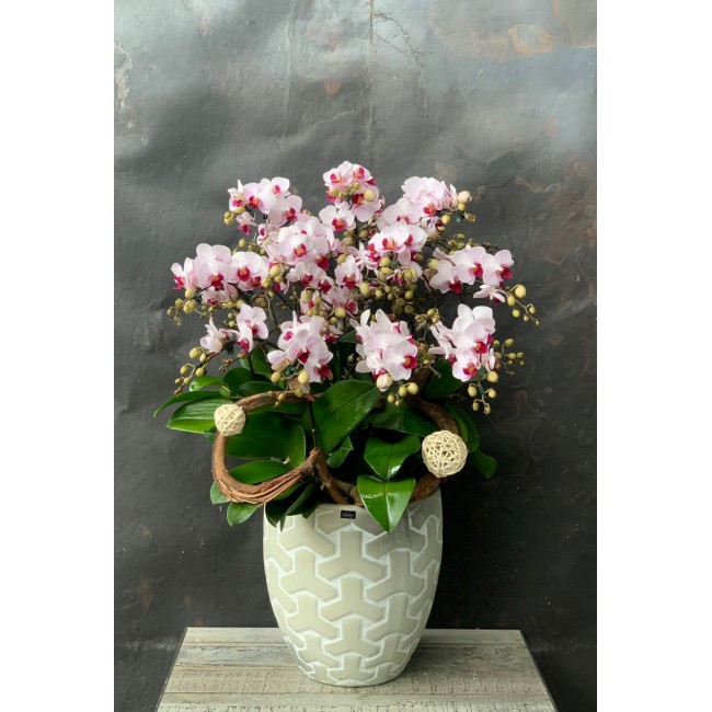 Dáng chậu cao, bề mặt đắp vân nổi màu kem trung tính hài hòa hoặc màu đen ấn tượng, đa dạng kích cỡ, nhỏ gọn dễ thương, rất thích hợp để trồng hoa lan tươi, cây cảnh văn phòng, cây để bàn, cắm hoa giả, hoa trang trí...