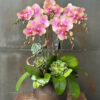 – Mô tả: Lan hồ điệp lớn hồng kèm phụ liệu decor: Sen đá, cây tổ phụng, củi lũa, cây tường xuân (tuỳ theo mùa).